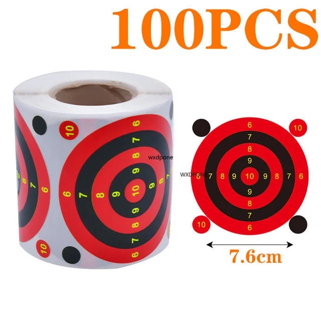 100 db Öntapadós reaktív lövőcélt tekercsben 7,6 cm Kerek papírcélok szóródás hatással fekete-piros színben, amely a találat után látható