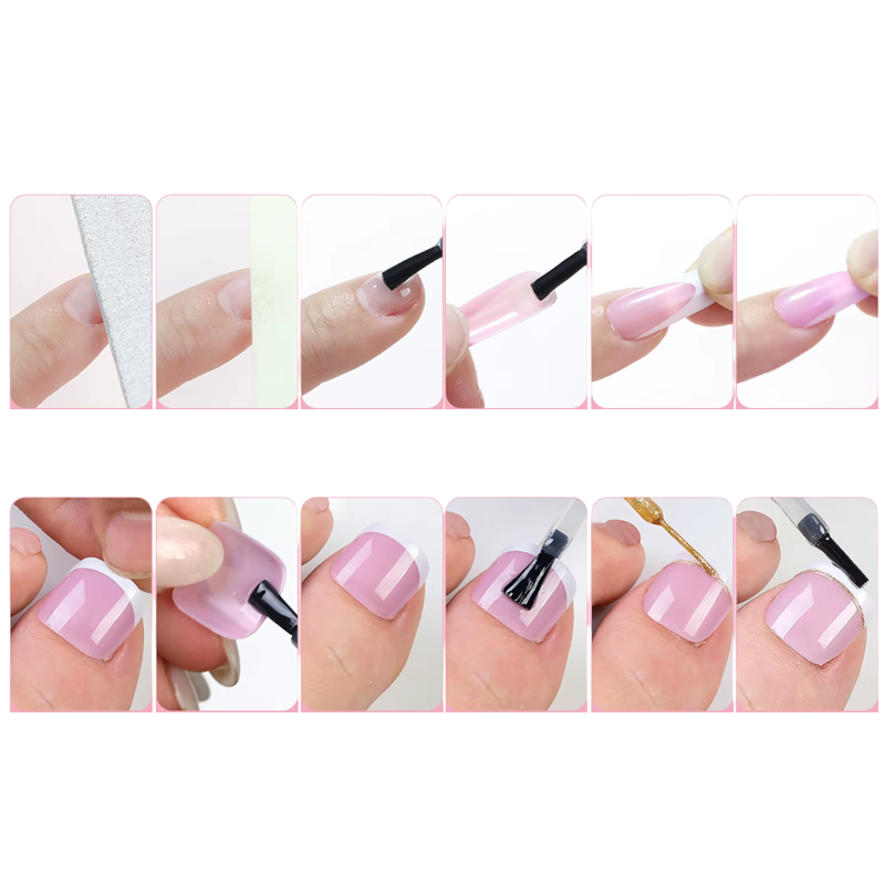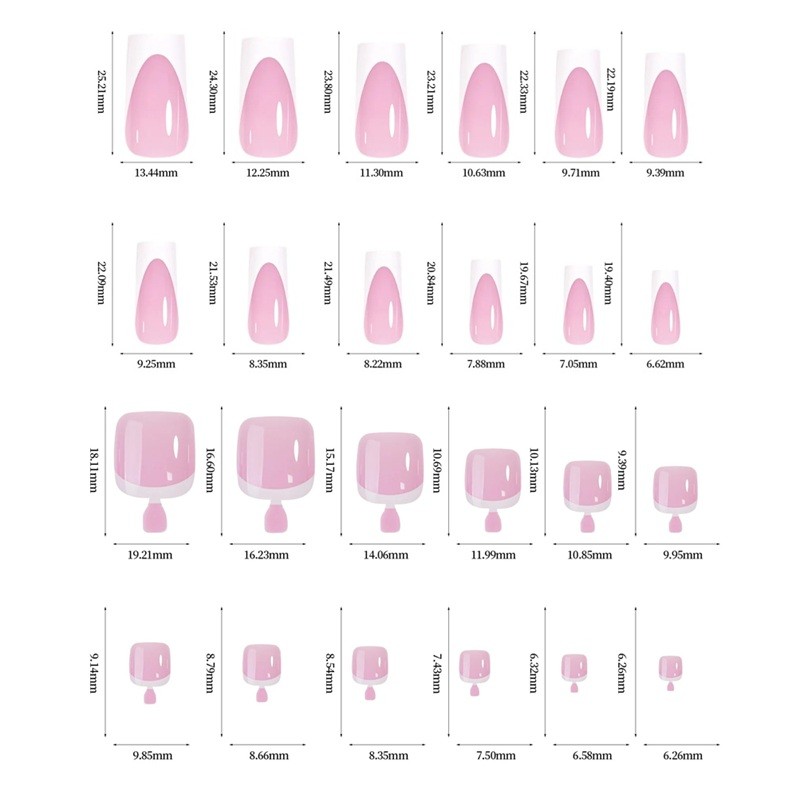 Ez a kiterjedt körömkészlet a kezek és lábak átfogó ápolására lett tervezve, egységes francia stílusban. A körmök négyzet alakja tiszta, ápolt és időtlen megjelenést kölcsönöz, míg a fényes akril felület elegáns, professzionális hatást biztosít. A 144 db műköröm elegendő készletet kínál ismételt használatra és körömszalonban való munkához. A 12 különböző méret praktikus elosztása lehetővé teszi a könnyű alkalmazkodást minden kéz- és lábujjhoz. A körmök realisztikusak, könnyűek és kényelmesek viselni.