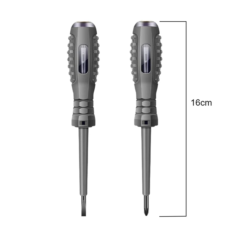 Ez a professzionális csavarhúzó készlet ideális segítőtárs minden villanyszerelő, otthoni barkácsoló és olyan felhasználók számára, akik biztonságosan és gyorsan szeretnék ellenőrizni az elektromos feszültség jelenlétét. A kereszt és lapos fej kombinációjával egy univerzális szerszámot kap, amely lehetővé teszi a különböző típusú csavarokkal való munkát. Az integrált feszültségvizsgáló 12–220V AC/DC áramkörökhez pontos információt nyújt arról, hogy az áramkör áram alatt áll-e.