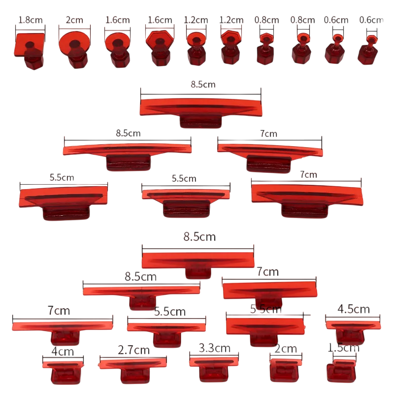 • 28 darabos horogkészlet különböző méretekben és formákban a különböző domború hibákhoz