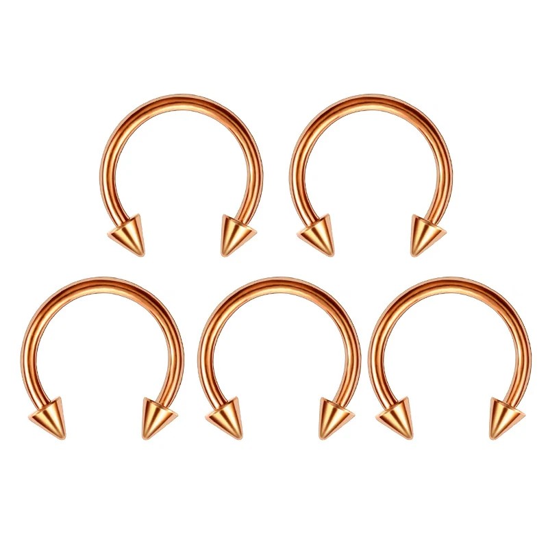 Öt darab 8 mm hosszú, hajlított patkó formájú sebészeti acél piercing készlet, amely különböző típusú testpiercingekhez alkalmas. Teljes leírás