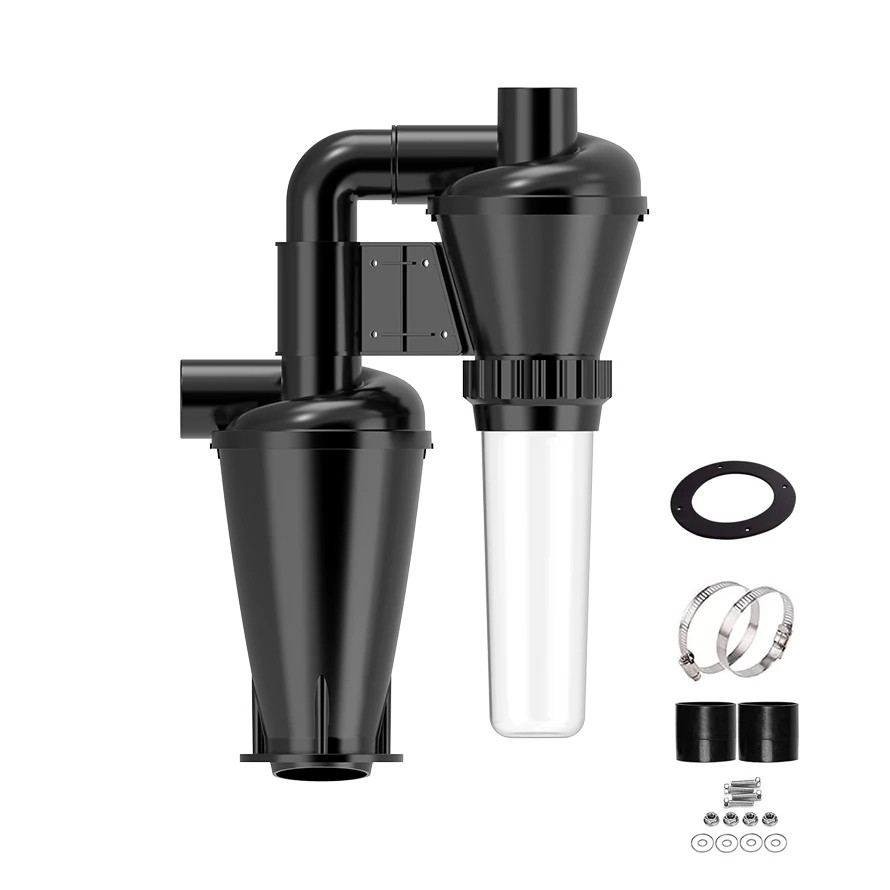 Ez a kettős ciklonpor-leválasztó 50 mm belső átmérővel a lehető leghatékonyabb módon van megtervezve a durva és finom szennyeződések leválasztására, amelyeket a porszívóba vagy a műhelyi elszívó rendszerbe szívnak. A 50 mm-es bemeneti méret azonnal megmutatja, hogy kompatibilis-e a tömlőivel. Erős centrifugális levegőáramot használ, amely lehetővé teszi, hogy a por a gyűjtőtartályban telepedjen le, még a porszívó előtt. Ez jelentősen csökkenti a szűrők eltömődését, meghosszabbítja élettartamukat és fenntartja a stabil szívóteljesítményt. Az egész szerkezet tartós anyagból készült, amely jól bírja a fa porral, forgácsokkal, műanyaggal, fémforgácsokkal és építési hulladékkal való munkát. A leválasztó alkalmas otthoni műhelybe, valamint igényesebb munkafolyamatokhoz is.