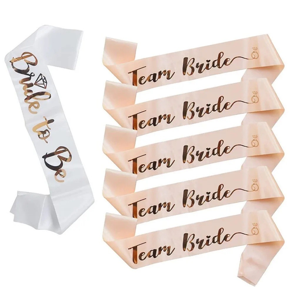 Ez a stílusos szalagcsomag tökéletes kiegészítő leánybúcsúra, hen party-ra vagy bridal shower-re. Hat darabot tartalmaz – öt szalagot a Team Bride felirattal rózsaszín-arany árnyalatban és egy fehér szalagot a Bride To Be felirattal a leendő menyasszony számára. A fehér és a finom rózsaszín-arany színkombináció arany fényes felirattal elegáns és ünnepélyes hatást kelt. A selyem anyag könnyű, kellemes tapintású és kényelmes viselni az egész ünnepség alatt.