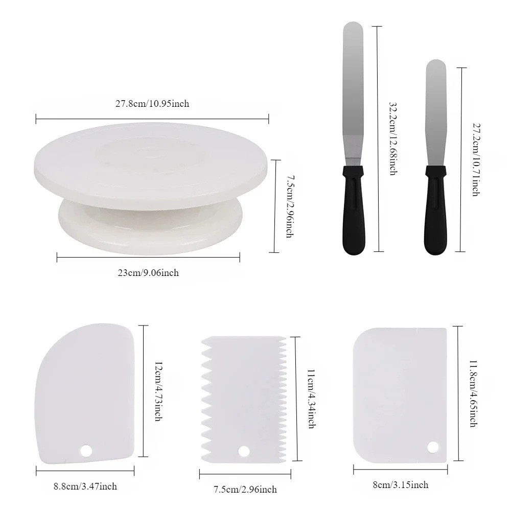 - 6 db-os készlet forgó állvánnyal, 2 simítóval és 3 spatulával tortákhoz.