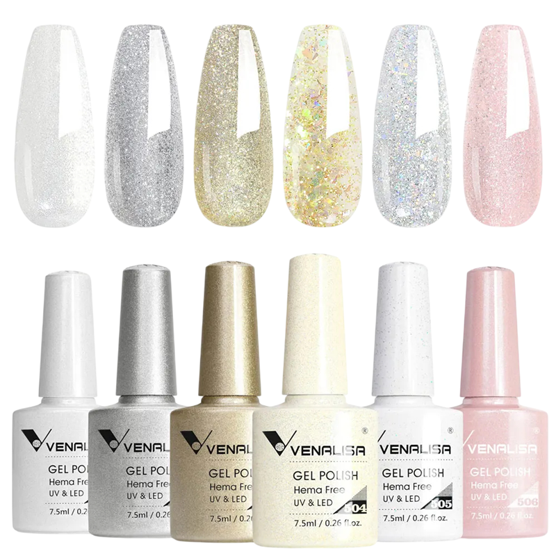 Főoldal Főoldal Egészség és szépség Körmök Körömlakkok 6 db UV LED gél lakk 7,5 ml Otthoni manikűr szett Csillogó hatás HEMA és TPO nélkül Környezetbarát félpermanens lakkok