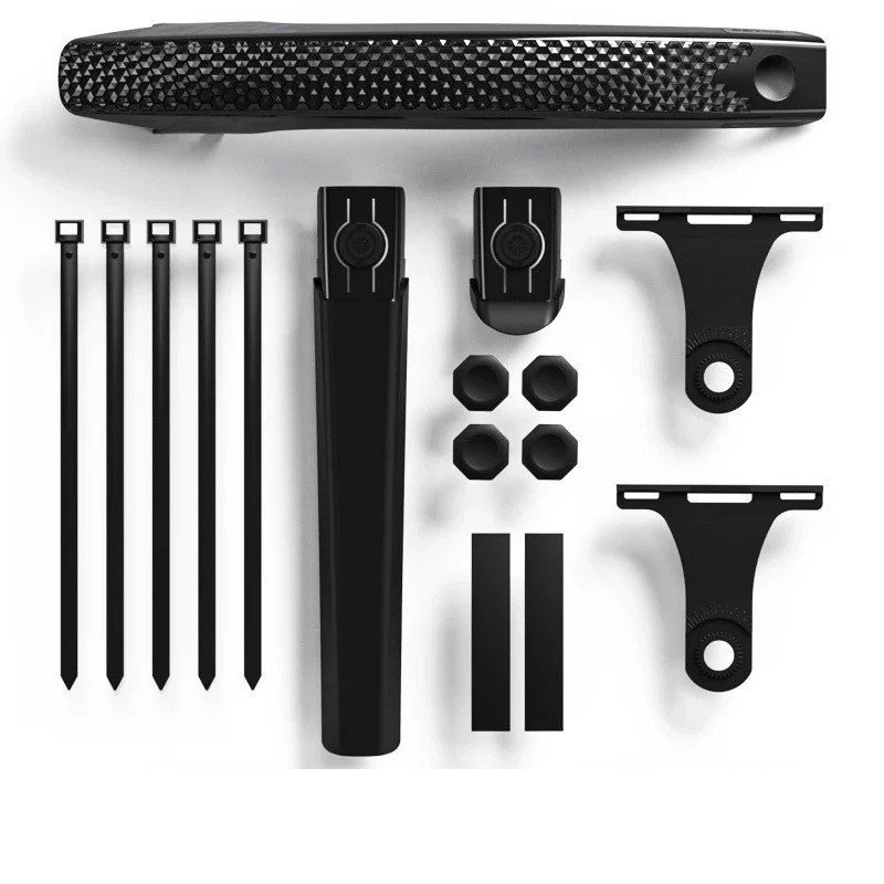 - Telepítési útmutató: a sárvédőt a gyorskioldó tartó segítségével a kerékpár vázához vagy villájához rögzítjük, az egyes elemeket a kívánt hosszúság szerint összekapcsoljuk és a mellékelt rögzítőelemekkel biztosítjuk