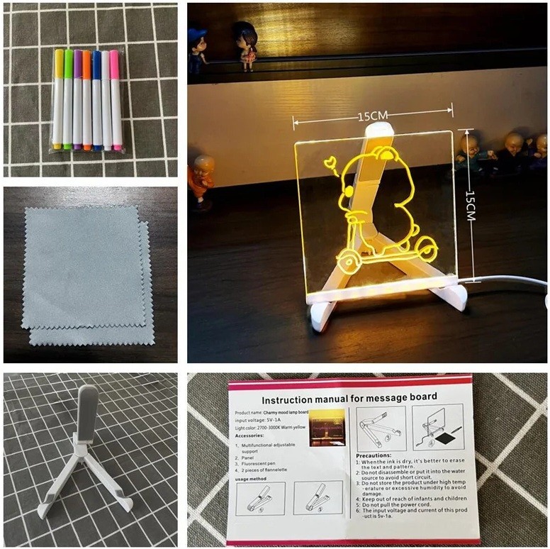 Akril átlátszó rajztábla 15 x 15 cm LED világító törölhető gyerek tábla állvánnyal 7 színes filccel