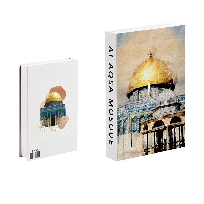 Elegáns falékonyha Al Aqsa Mecset motívummal és kiemelkedő arany kupolával, amely stílusos kiegészítője a modern belső térnek. A részletes építészeti illusztráció a finom vintage hatással luxus és időtlen megjelenést kölcsönöz. Ez egy neotévíratelné díszítő könyv, amely kizárólag dekorációs célokra készült. A valósághű kidolgozás olyan hatást kelt, mintha egy valódi kötet lenne kiállítva a könyvtárban.