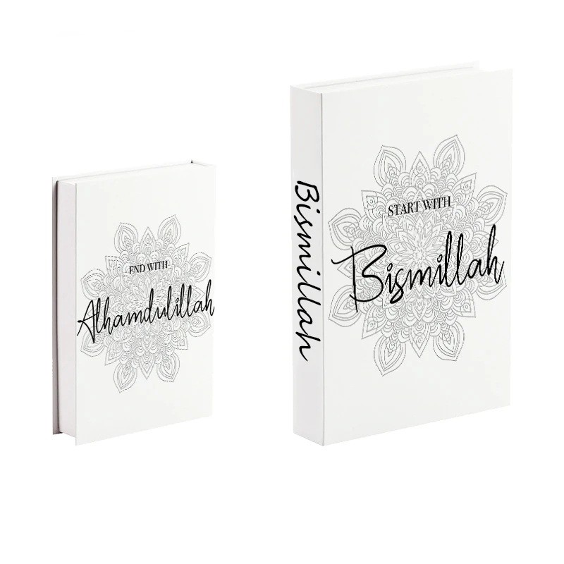 Ez az elegáns álc könyv kiemelkedik a finom dizájnjával, részletes mandala motívummal és hangsúlyos Bismillah és Alhamdulillah feliratokkal. Az elülső oldalát a „Start with Bismillah“ szöveg díszíti, míg a hátsó rész a „End with Alhamdulillah“ feliratot viseli, ami harmonikus és szimbolikus egységet teremt. A minimalista fekete-fehér kivitel tiszta, modern megjelenést kölcsönöz, és könnyen beilleszthető különböző típusú belső terekbe. A könyv gerincén Bismillah felirat található, így a makett valósághűen illeszkedik a többi könyv közé. Praktikus előnye a nyitható kivitel rejtett tárolóhellyel.