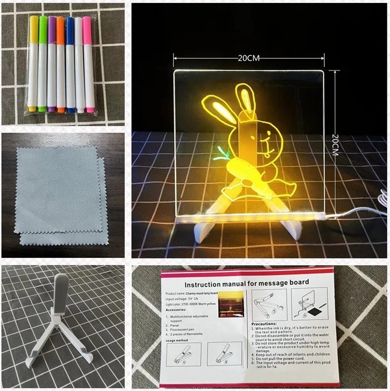 Átlátszó világító akril rajztábla 20 x 20 cm törölhető gyerek tábla állvánnyal 7 színes filctollal