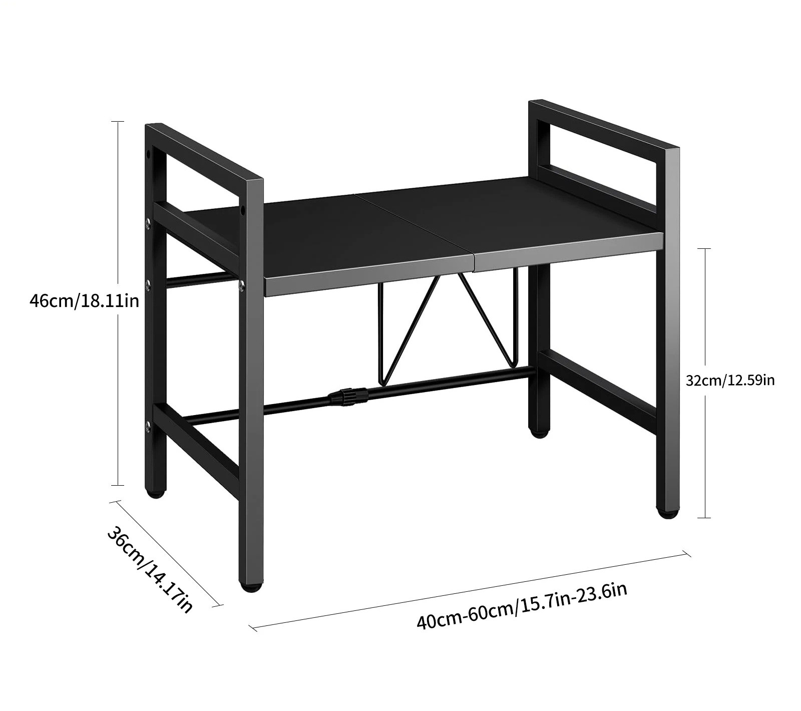A bővíthető mikrosütő állvány praktikus megoldást kínál a konyhai tér hatékony kihasználására. Az állítható szélesség 40–60 cm lehetővé teszi a különböző méretű mikrosütők vagy egyéb készülékekhez való alkalmazkodást. A fém és PP műanyag konstrukció biztosítja a szilárdságot, stabilitást és a hosszú élettartamot a mindennapi használat során. A teljes méretek 40–60 x 36 x 46 cm elegendő tárolóhelyet biztosítanak a polc felett és alatt. Az elegáns fehér kivitel tiszta és modern hatást kelt.