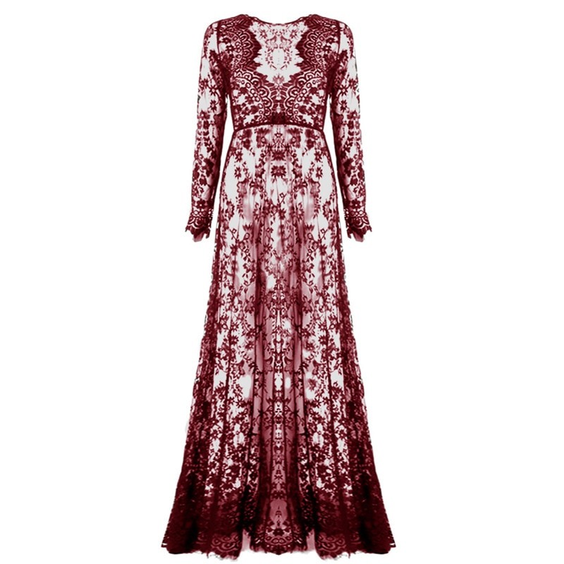 Hosszú csipke maxiruha, hosszú ujjakkal és mély nyakkivágással.