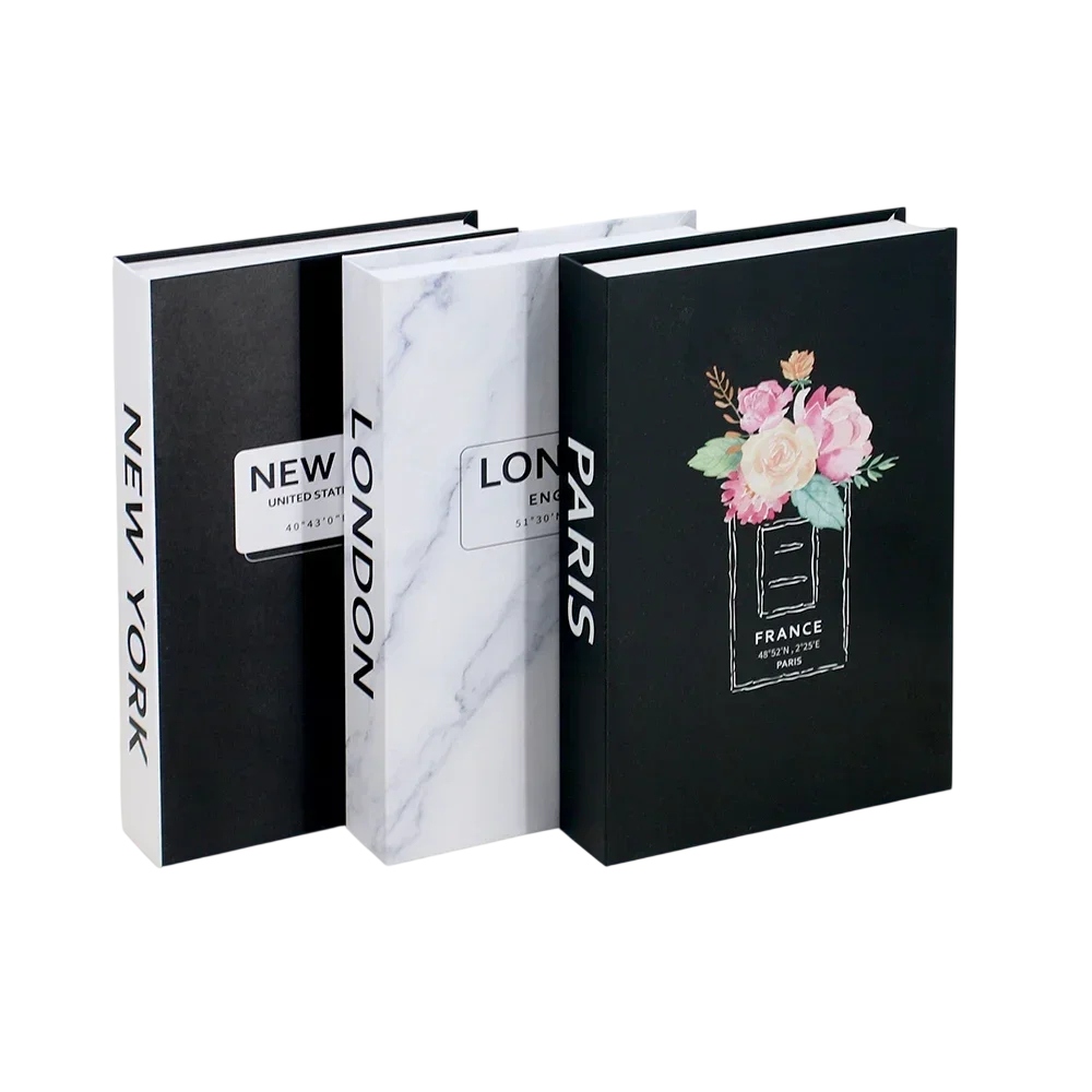 Luxus dekoratív hamis csípő szettje elegáns fekete-fehér kivitelben ötvözi a modern városi stílust finom dizájn részletekkel. A New York, London és Párizs motívumokat márványos megjelenés és virágos akcentus egészíti ki, amely kifinomult kontrasztot ad a dekorációnak. A csípő nem nyithatóak és kizárólag esztétikai kiegészítőként szolgálnak. Az egységes formátum és időtlen dizájn miatt tökéletesen illeszkednek a dohányzóasztalra, polcra, könyvespolcra vagy komódra. Az összhatás luxus, modern és nagyon ízléses.