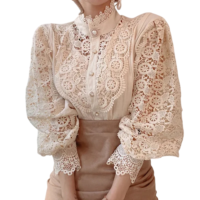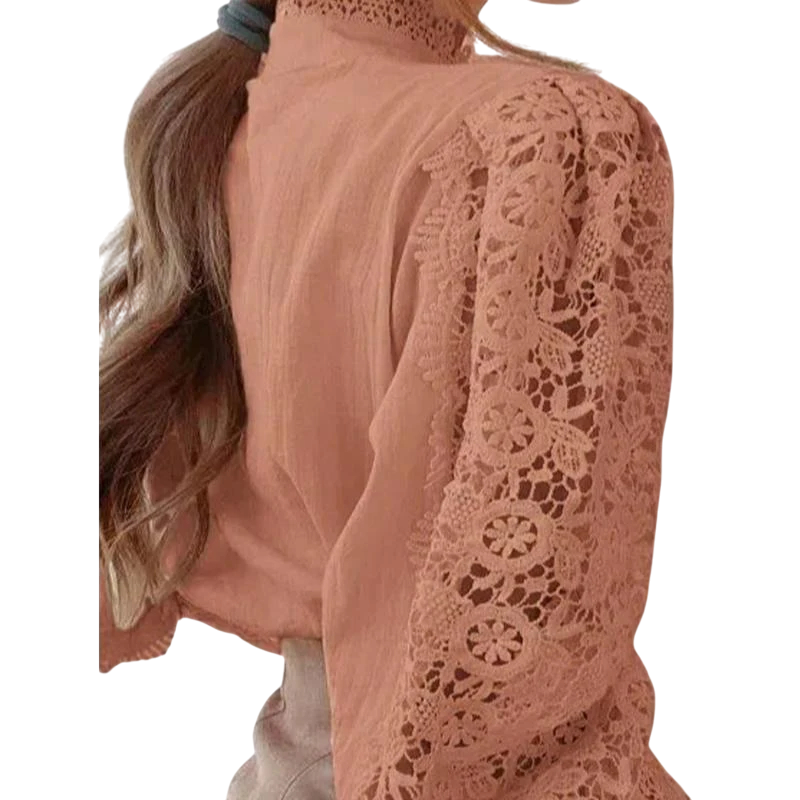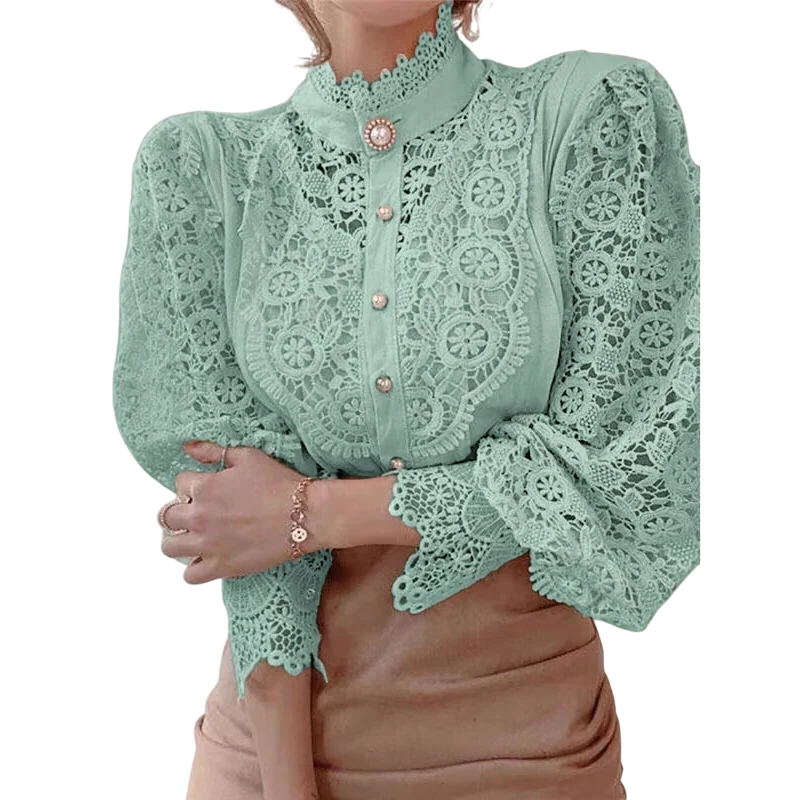 Elegáns női csipkés ing fodrokkal és gallérral Egyszínű blúz hosszú ujjakkal és gombos záródással Stílusos top pamutból és poliészterből