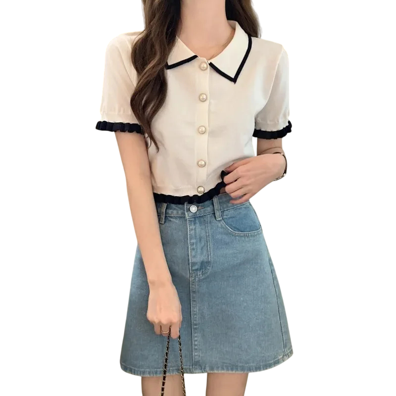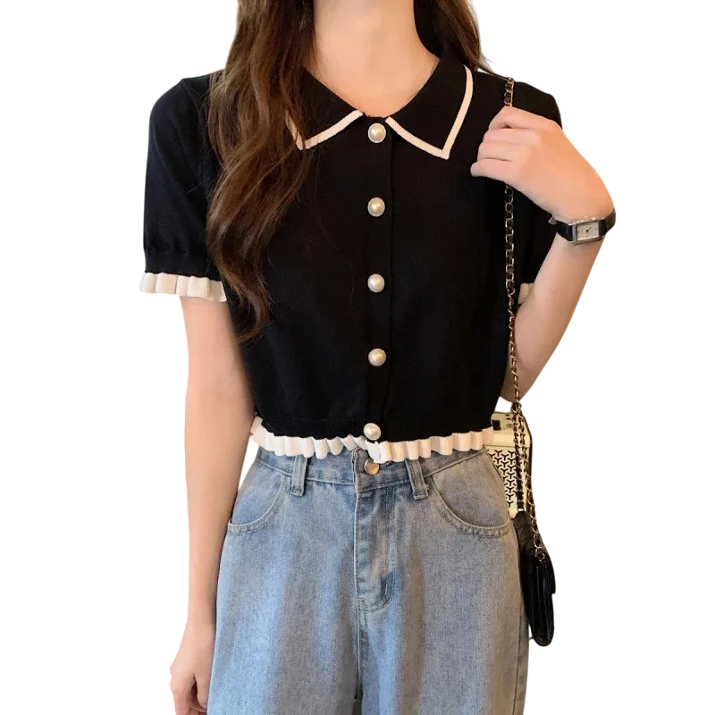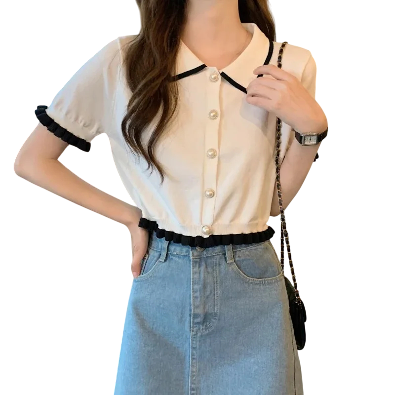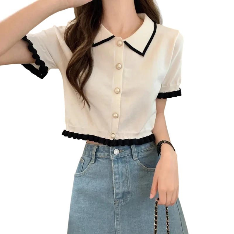 Elegáns női ing rövid ujjakkal Egyszínű blúz poliészterből gallérra varrt csíkokkal és fodrokkal a ujjakon Stílusos gombos top