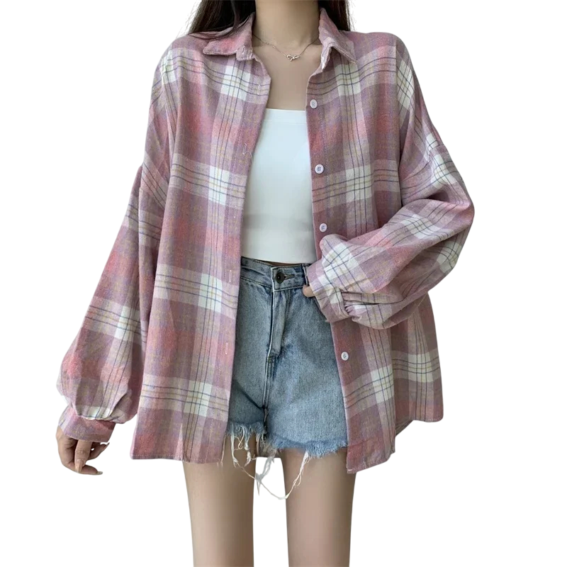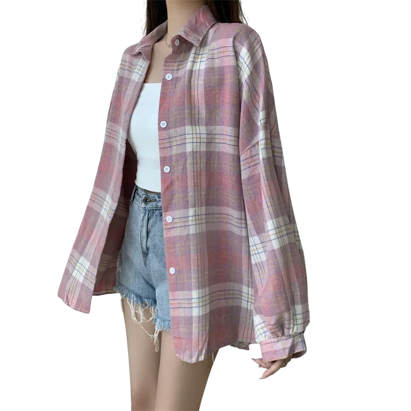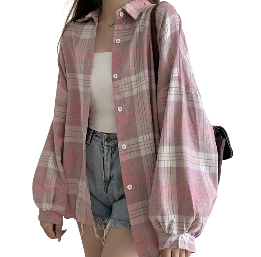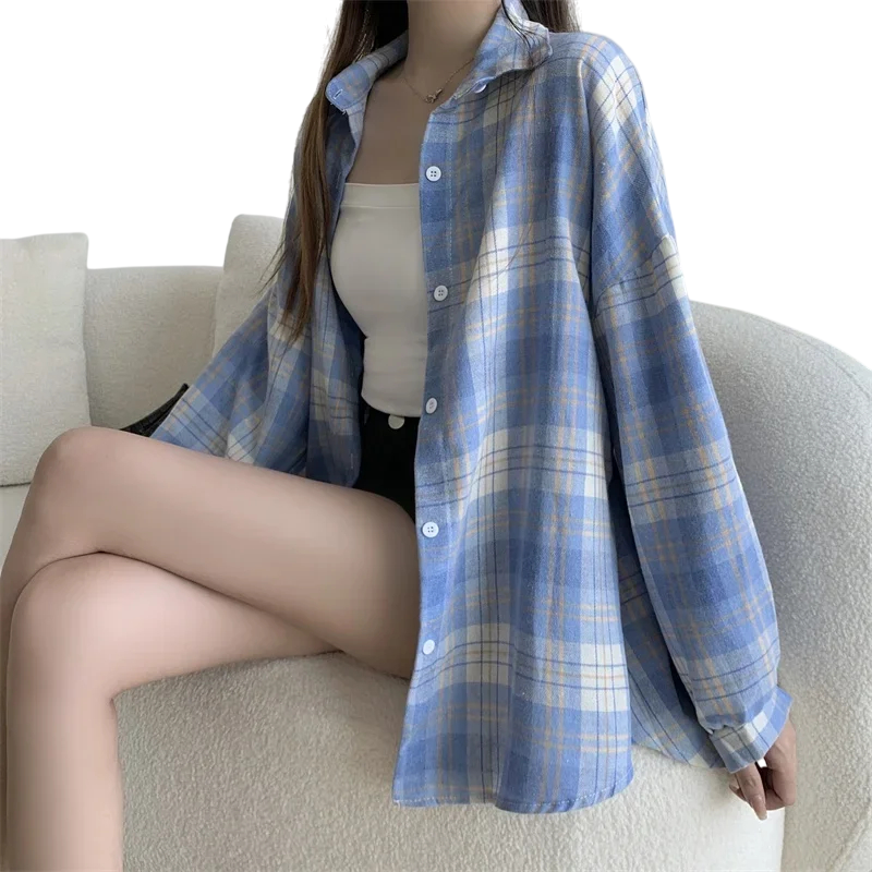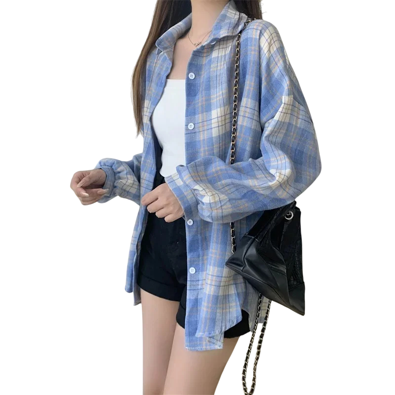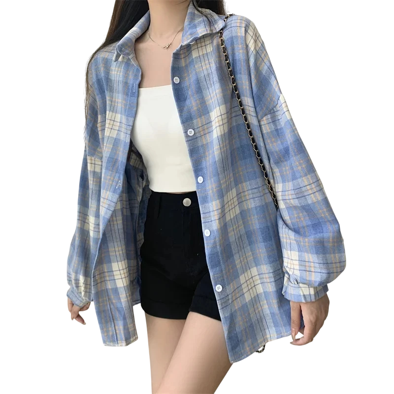 Főoldal Főoldal Ruhák és kiegészítők Női Női ingek Női kockás ingek Elegáns női kockás ing gallérral Szabad szabás gombos záródással Könnyű poliészter blúz mindennapi viselethez