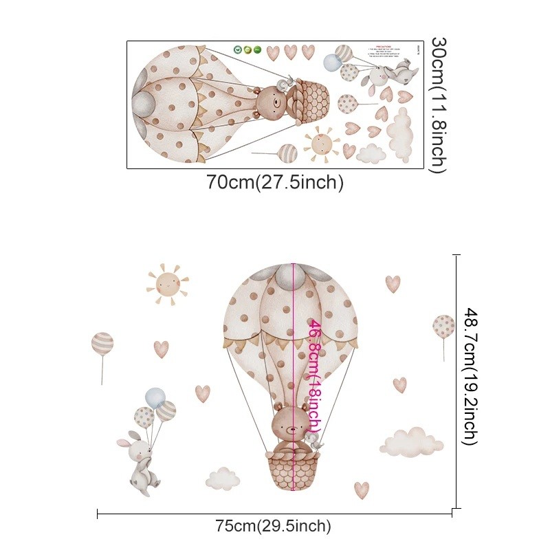 Ez a fali dekoráció egyszerű módot kínál a gyerekszoba felélénkítésére festés vagy fúrás szükségessége nélkül. Az állatos minta a lufiban játékos, de egyben megnyugtató elemet teremt, amely fiúknak és lányoknak egyaránt megfelel. A magas minőségű vinylnak köszönhetően nem kell aggódnia a leválás miatt még hosszabb idő elteltével sem.