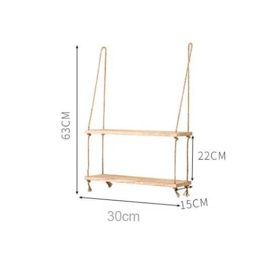A két szintes fali polc mérete 30 x 15 cm, több tárolóhelyet biztosít anélkül, hogy a padlófelületet elfoglalná. A felfüggesztés teljes magassága körülbelül 63 cm, a polcok közötti távolság kb. 22 cm. A fenyőfából készült szerkezet és a tartós kötél biztosítja a stabilitást és a hosszú élettartamot.