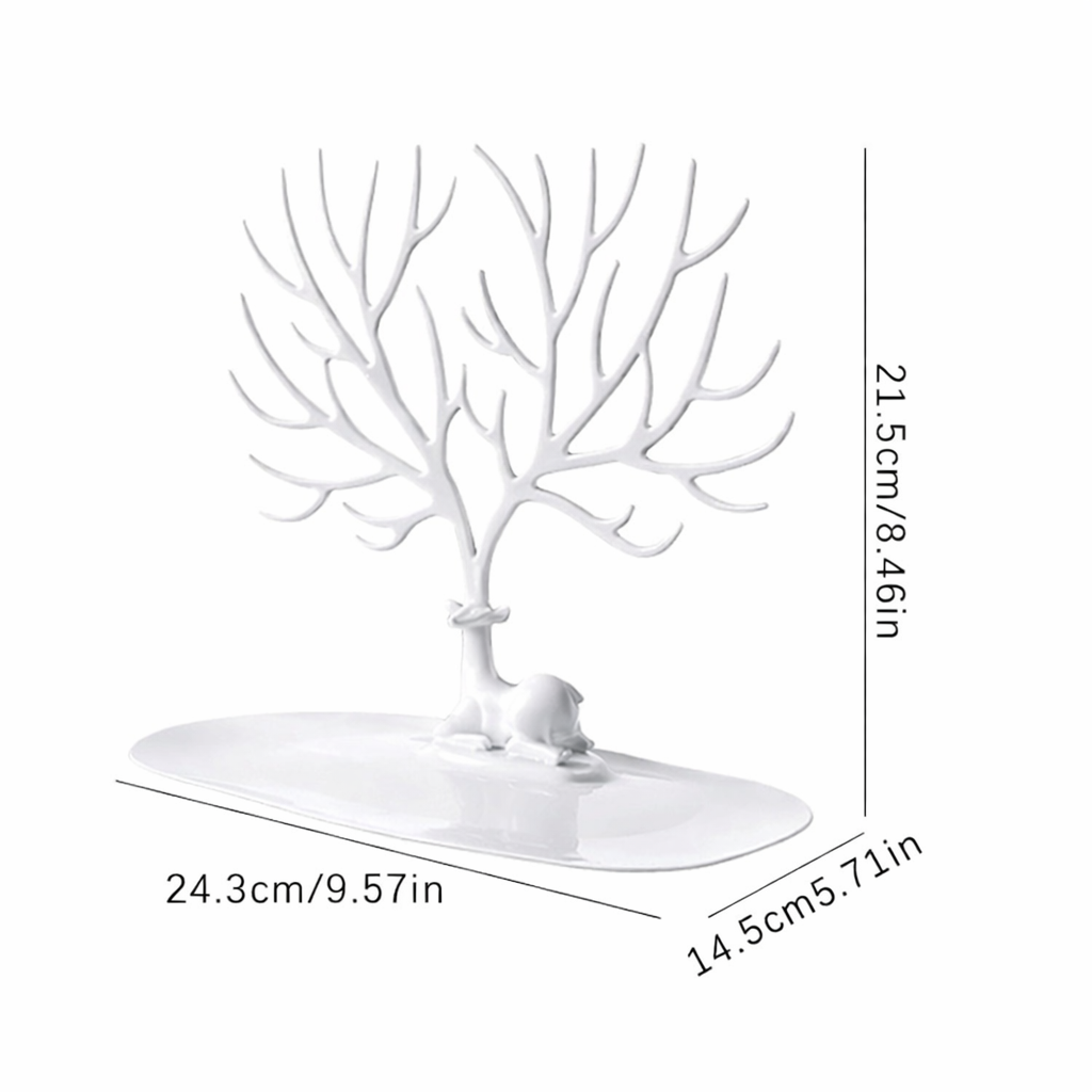 Az asztali ékszertartó állvány fa formájú praktikus megoldást kínál a karkötők és nyakláncok rendezésére. A stabil talapzat és az ágak lehetővé teszik az ékszerek kényelmes akasztását és áttekinthető rendezését. A magasság 21,5 cm, a talapzat hossza 24,3 cm, és a szélesség 14,5 cm elegendő helyet biztosít különböző típusú ékszerek számára. A fehér szín és az akril anyag modern és tartós dizájnt biztosít, amely minden belső térhez illik.