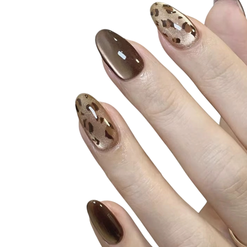 Kiemelkedő fémes körmök leopárd mintával mandula formában kényelmes viseletet és stílusos megjelenést kínálnak, alkalmasak mindennapi és ünnepi napokra. Teljes leírás
