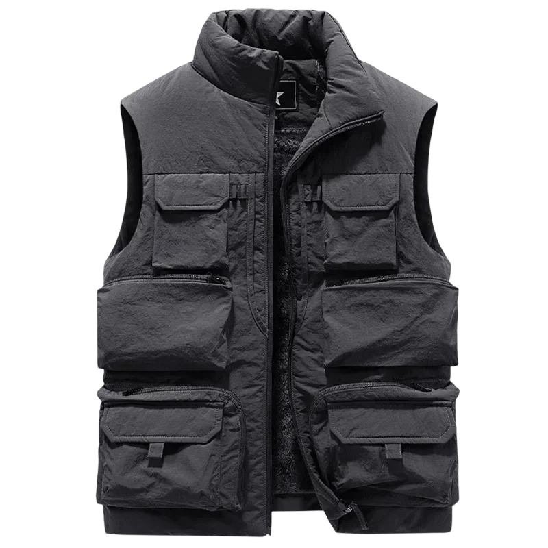 Férfi bélelt mellény belső szőrme és cipzáras galléros zsebekkel poliészter elasztán túrázáshoz, horgászathoz és kültéri munkához