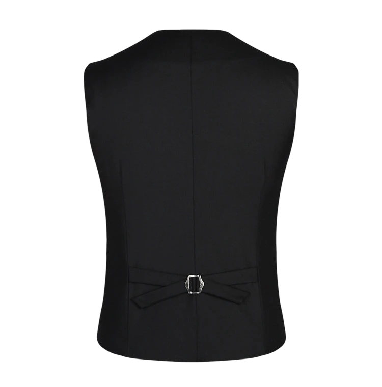 - Dizájn: egyszínű mellény gallérral, zsebekkel és zsebkendővel a mellkason