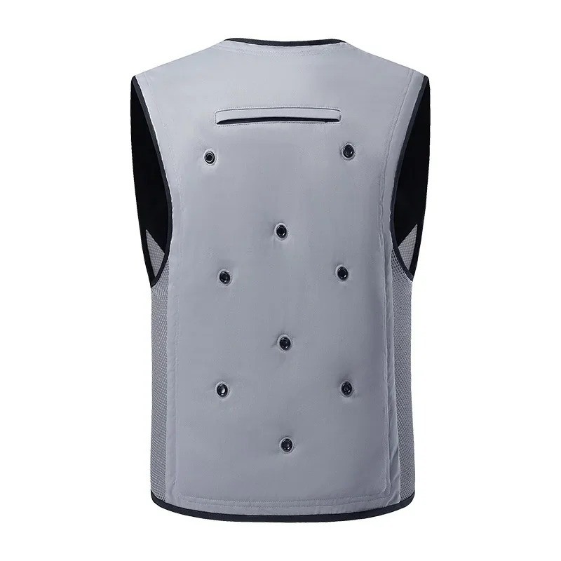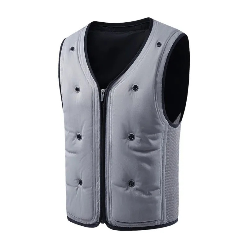 A férfi hűtőmellény praktikus ruházati kiegészítő, amely meleg környezetben való használatra készült. Ujjatlan szabásának köszönhetően könnyen felvehető póló vagy munkaruha fölé, és különböző kültéri tevékenységekhez is alkalmas lehet.