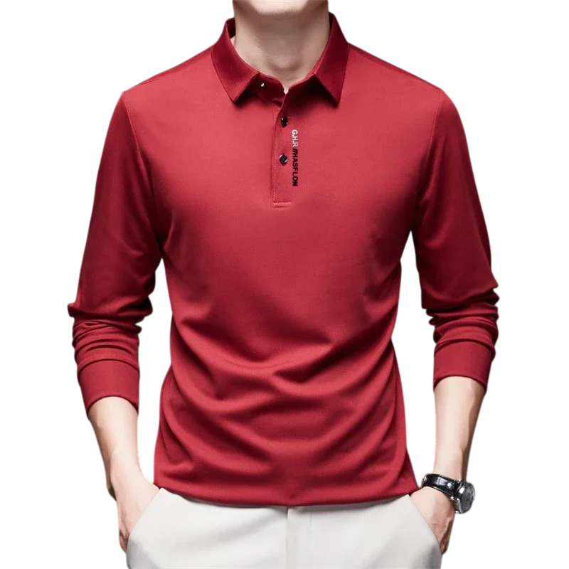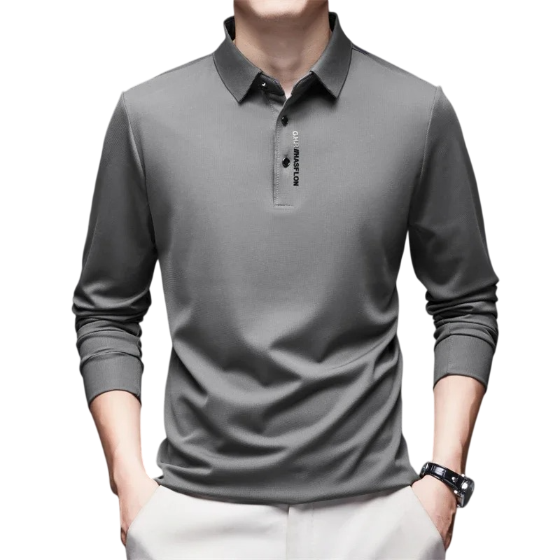 Egyszínű férfi póló hosszú ujjal, gallérral és gombokkal, könnyű poliészterből készült, amely rendezett megjelenést és univerzális felhasználást kínál. Teljes leírás
