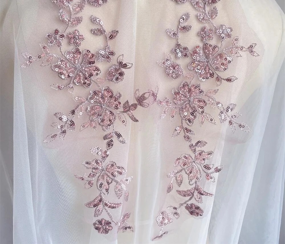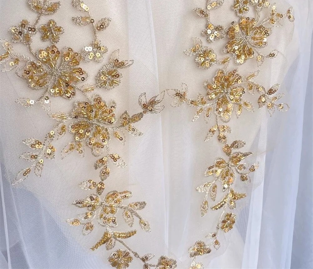 A hímzés kiváló minőségű poliészter anyagból készült, amely tartós, ellenálló és egyben rugalmas a munkavégzés során. A dekoratív flitterek és gyöngyök finom fényt és elegáns megjelenést kölcsönöznek az alkalmazásnak, ezért különösen alkalmas ünnepi és esküvői öltözetekhez.