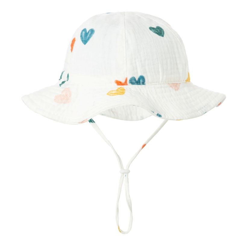 Gyerek pamut kalap szív mintával, állítható 34–39 cm fejkerület, 23 cm napellenző, 13 cm mélység, csecsemő nyári kalap 3–12 hónapos korig