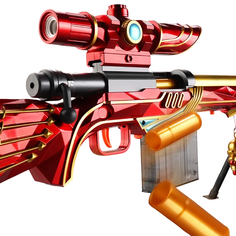 A gyerek sniper pisztoly, amely a M24 designja alapján készült, valósághű megjelenést és szórakoztató játékélményt kínál a kis kalandorok számára. A nagyobb méretek miatt a játék autentikusnak tűnik, és lehetővé teszi a gyerekek számára, hogy belemerüljenek az akciójátékokba és a kalandos forgatókönyvekbe. A puska tartós műanyag anyagból készült, amely biztosítja a könnyűséget és a kényelmes használatot. Az összesen kb. 109 cm hosszúság valósághű fogást és jobb játékélményt nyújt. Az ergonomikus kialakítás kényelmes kezelést tesz lehetővé játék közben.