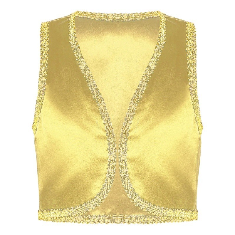 Stílusos gyermek arany dzsinn mellény fényes szegéllyel, ideális farsangra, Halloweenra vagy cosplay-re. Könnyű és kényelmes jelmez a kis hercegeknek. Teljes leírás