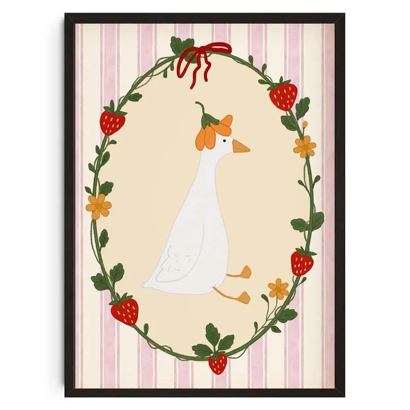 A motív kacsát, virágokat és epreket kombinál, így dekoratív illusztrációt hoz létre, amely különösen dekoráció gyermek szobájába alkalmas. A posztert önállóan vagy egy nagyobb képgaléria részeként is elhelyezheti. A keret nélküli kivitel lehetővé teszi az egyedi felfüggesztést vagy a saját kerettel való kiegészítést.