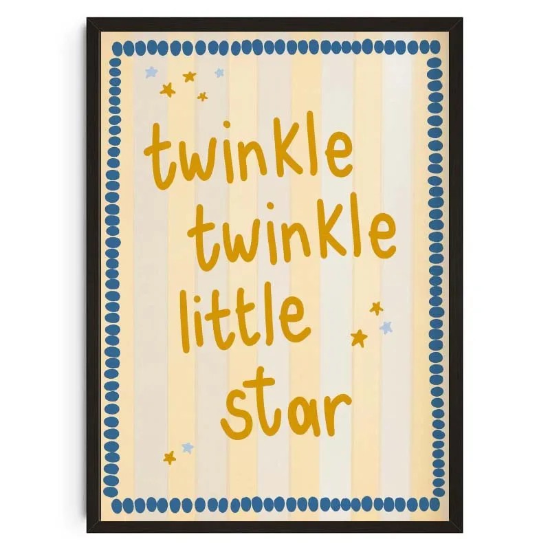 Finom gyermek poszter csillagokkal és a twinkle twinkle little star felirattal. Formátum 20 × 30 cm, vászonnyomtatás a gyermek szoba dekorációjához. Teljes leírás