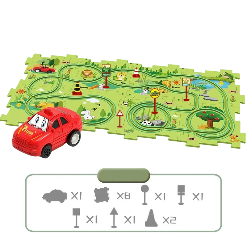 • 1 db kisautó és 14 db puzzle darab a vasút összeállításához