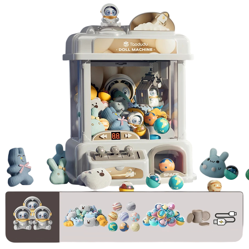 Ez a gyermek űrhajós játékautomata otthon hozza el egy igazi szórakoztató központ hangulatát, és minden gyermek szobáját saját játszóterévé alakítja. A nagy átlátszó kamra színes játékok sokféleségével van tele – színes bolygók, meglepetést rejtő kapszulák, puha plüss figurák és három aranyos mackó űrhajós sisakban. Belül egy játékarma található, amelyet a gyerekek három kar segítségével irányítanak az elülső panelen. Ennek köszönhetően az kart oldalra, előre és hátra mozgathatják, és leengedhetik, hogy megpróbálják megragadni a kiválasztott játékot. Az automata méretei 30 x 26 x 19 cm, így kényelmesen elfér egy asztalon vagy komódon, miközben elegendő helyet biztosít a játékhoz.