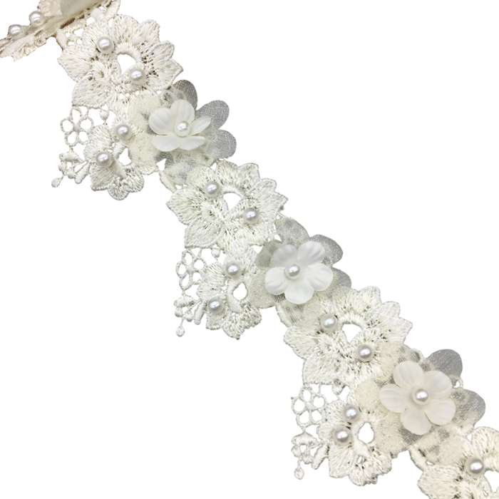 A szalag poliészter és pamut keverékéből készült, amely biztosítja a tartósságot, hosszú élettartamot és kellemes textúrát. A hímzett virágok és apró gyöngyök hangsúlyos dekoratív hatást és finom romantikus stílust adnak a szalagnak. Ezért ideális például ruhák díszítésére, esküvői dekorációk készítésére vagy kreatív DIY projektekhez.