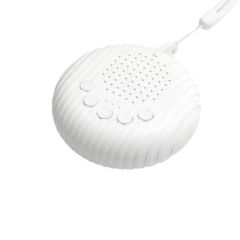 Hordozható gyerek altató gép 10 megnyugtató hanggal, állítható hangerővel, beépített újratölthető akkumulátorral, USB, fehér színben