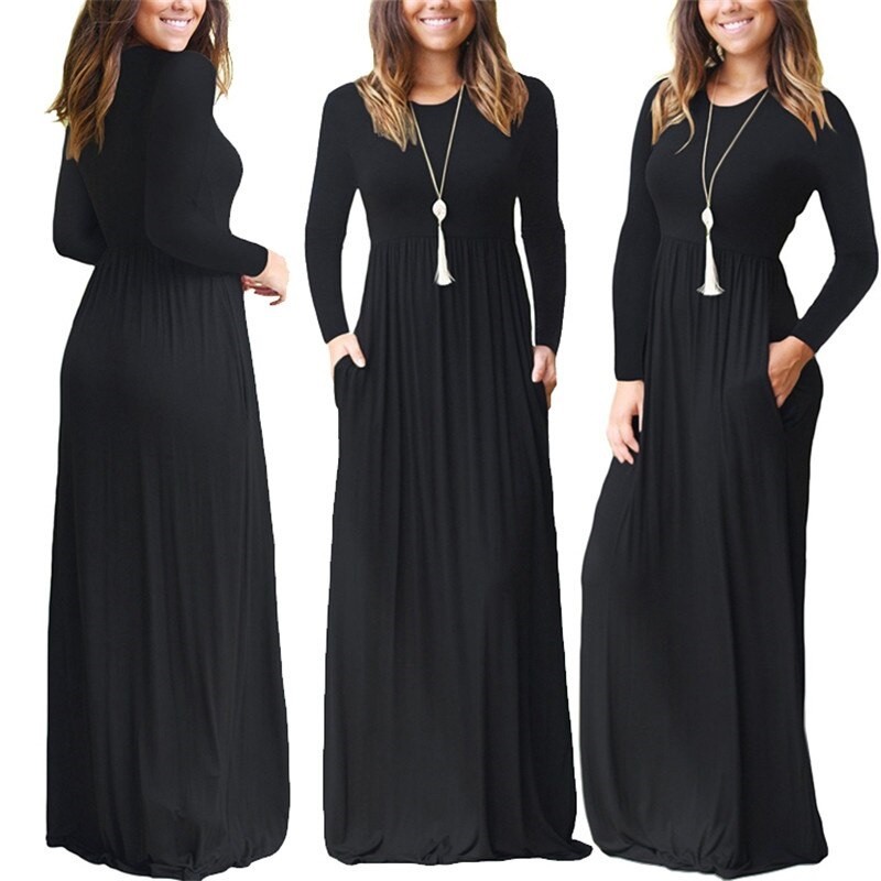 Hosszú, széles szoknya és klasszikus kerek nyakkivágás.