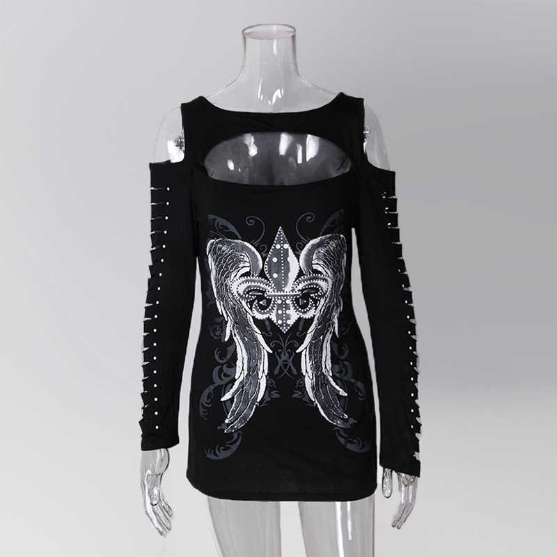 Ez a hosszú ujjú póló nem csak a vállán lévő lyukak miatt eredeti, hanem az ujjak nagyon szép kialakítása miatt is.