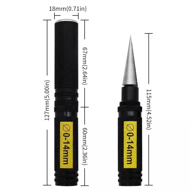 A kézi kúpos kivágó praktikus eszköz mindenki számára, aki pontosan szeretné bővíteni vagy simítani a lyukat fában, műanyagban vagy puhább lapanyagokban. A 13 x 1,8 x 1,8 cm-es kompakt méretének köszönhetően kényelmesen elfér a zsebben vagy egy kis szerszámtáskában, és mindig készen áll a használatra. Az ellenálló acélból készült éles kúpos hegy lehetővé teszi a lyuk fokozatos bővítését anélkül, hogy szálakat tépne vagy forgácsokat hagyna. A pengén méretjelölés található, így munkavégzés közben azonnal áttekintheti a lyuk méretét. A zárható tok texturált felülete védi a hegyet szállítás közben, és egyben kényelmes fogantyúként is szolgál.