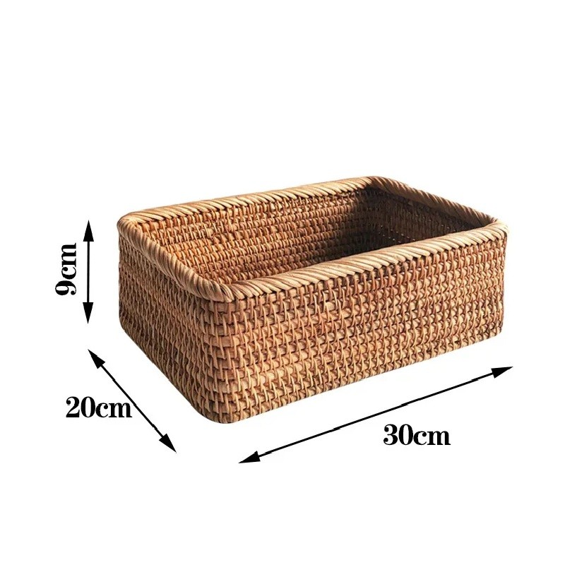 Ez a kézzel szőtt tároló kosár praktikus és rendezett megoldást kínál a mindennapi háztartás szervezésére. A 30 x 20 x 9 cm-es méretének köszönhetően elegendő helyet biztosít a kisebb tárgyak tárolására anélkül, hogy robusztusnak tűnne vagy felesleges helyet foglalna el. Ideális azok számára, akik szeretnék, hogy a dolgaik rendezettek és könnyen hozzáférhetők legyenek. Az egyszerű téglalap alak lehetővé teszi a könnyű elhelyezést polcokon, szekrényekben vagy komódokon. A kosár természetesen illeszkedik a különböző belsőépítészeti stílusokhoz.