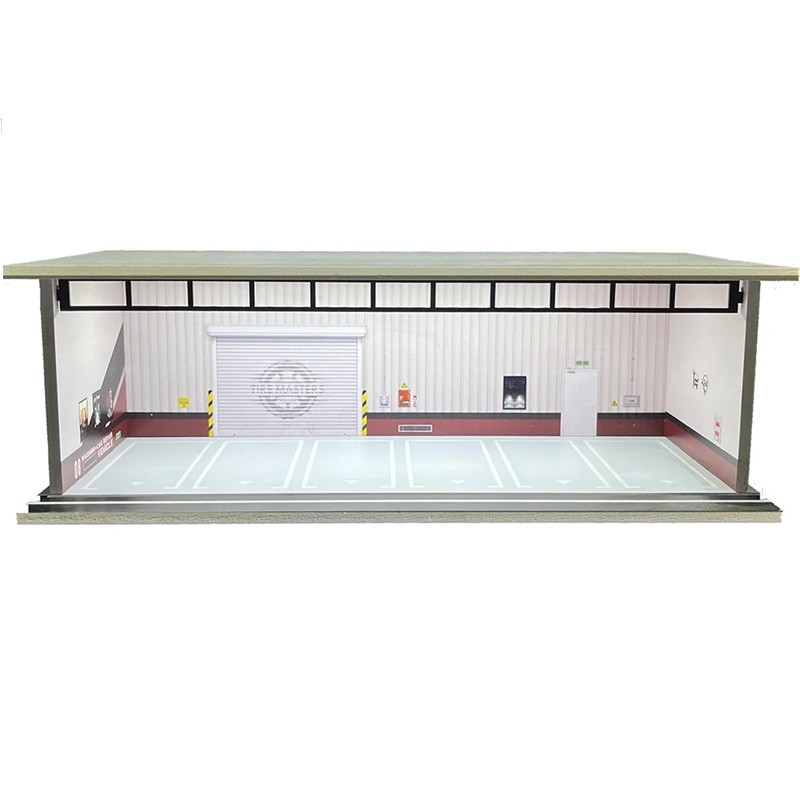Realisztikus kiállítási jelenet autómodellekhez részletes belső térrel, gördülő kapukkal és parkolóhellyel, ideális gyűjtőknek és fényképezéshez. Teljes leírás