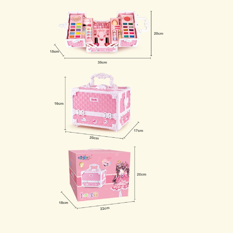 Ez a gyönyörű gyerek kozmetikai táska mindent tartalmaz, amire a kis divatmániásoknak szükségük van a kreatív játékhoz és a felnőttek sminkjének utánzásához. A táska mérete 20 × 17 × 16 cm, elegendő helyet biztosít, és nyitva (39 × 20 × 15 cm) egy áttekinthető és játékos kozmetikai állomássá alakul. Tartalmaz 49 darab kiegészítőt, amelyek segítségével a gyerekek saját színes kombinációkat hozhatnak létre és felfedezhetik a smink világát. A paletták szemhéjpúdereket, csillogó szemhéjpúdereket, pirosítókat, rúzsokat és púdert tartalmaznak a szórakoztató sminkeléshez. Tartalmaz továbbá műkörmöket, körömlakkokat, ujjelválasztókat és egyéb felszerelést, amely minden kis stylistát örömmel tölt el.