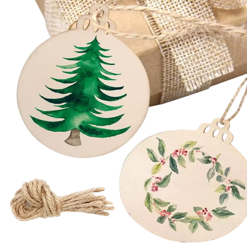 - A csomag tartalma: 10 db karácsonygömb alakú fa lap és 10 db zsinór