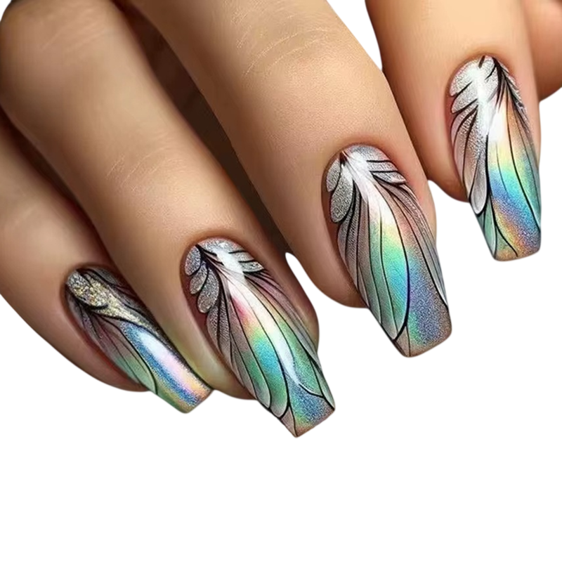 Ezek a körömtippek azoknak a vásárlóknak készültek, akik szeretnének kifejező és vizuálisan érdekes manikűrt készíteni szalonlátogatás nélkül. A szett 24 darab műkörmöt tartalmaz, amelyek lehetővé teszik a két kéz összehangolt megjelenését, valamint biztosítanak tartalékot a megfelelő méret kiválasztásához. A coffin (koporsó) forma a népszerű modern sziluettek közé tartozik, és kifejező, de egyben kiegyensúlyozott hatást kelt. A szivárványos kromatikus hatás fényes felületet hoz létre, amely a fény hatására változtatja a színeket, és egyedi karaktert ad a körmöknek. Az öntapadó kialakításnak köszönhetően a szett alkalmas otthoni manikűrre bonyolult előkészítés nélkül.