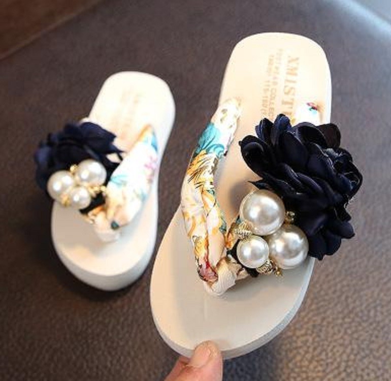 A gyöngyökkel és virágokkal díszített lány papucsokat nyári napokon ruhákkal fogják használni a lányok.