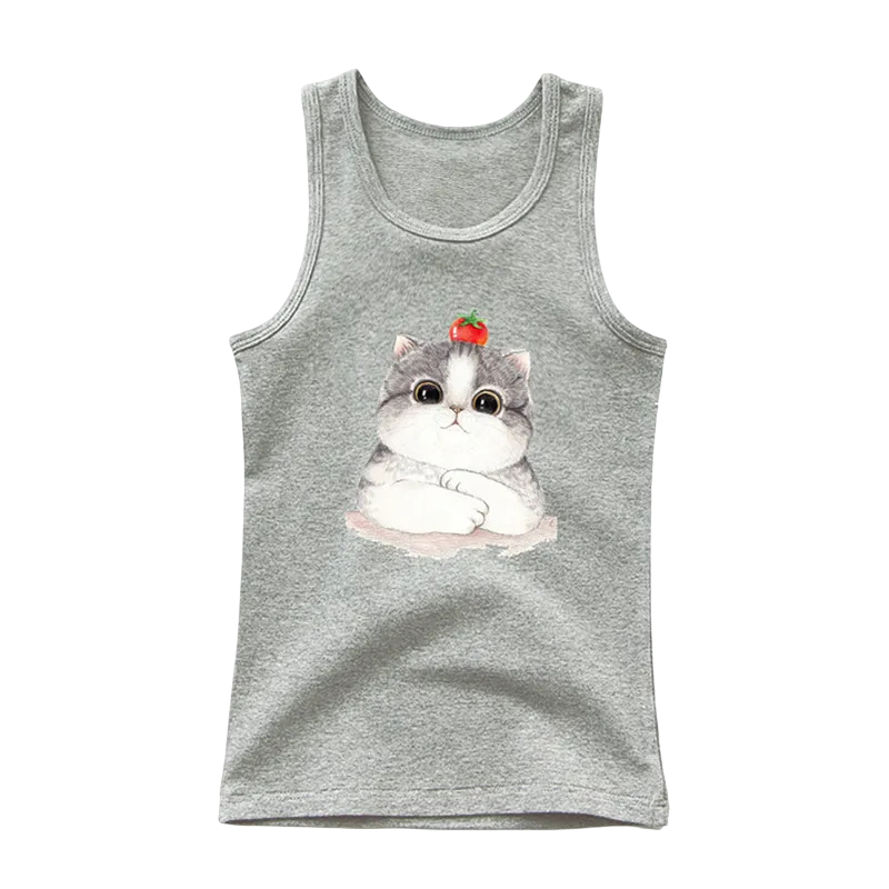 Lány nyári ujjatlan trikó 100% pamut Egyszínű póló rajzolt macskával Hercegnős top gyerekeknek Puha kényelmes trikó különböző színekben