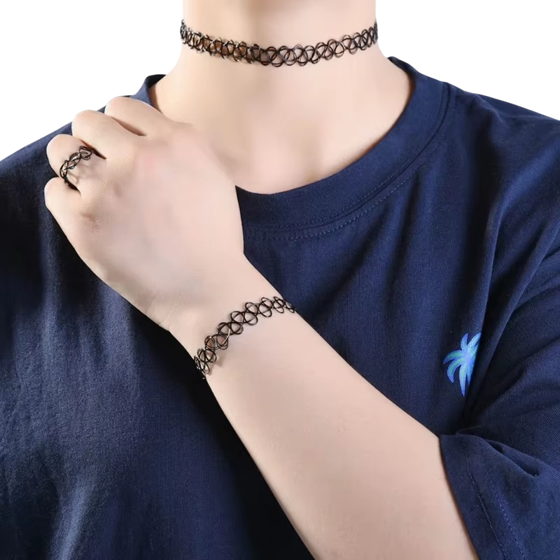 Ez a lázadó háromrészes ékszerkészlet nőknek ideális választás mindazok számára, akik szeretik a kifejező stílust és szeretnék egyedi jelleget adni öltözetüknek. A készlet rugalmas choker nyakláncot, karkötőt és gyűrűt tartalmaz, amelyek rugalmas kialakításuknak köszönhetően könnyen alkalmazkodnak a különböző méretekhez és kényelmesen illeszkednek egész nap. A modern geometrikus „tetoválás” mintázat finom csipkés hatást kelt közvetlenül a bőrön, és merész, de mégis stílusos megjelenést kölcsönöz az összképnek. Az ékszerek ellenállóak és kényelmesek a viselésre, így alkalmasak mindennapi öltözetekhez, mind pedig bulikhoz, koncertekhez vagy fesztiválokhoz. Ez a készlet tökéletes nőknek és lányoknak, akik ki akarnak tűnni a tömegből és modern csillogást szeretnének adni ruháiknak.