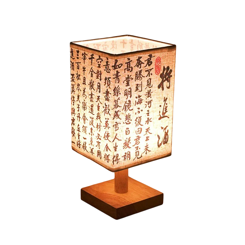 Dekoratív LED lámpa kínai karakterekkel, len árnyékolóval és fából készült állvánnyal, amely nyugodt világítást teremt, ideális éjjeli szekrényre. Teljes leírás
